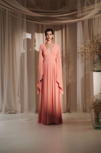 An enchanting evening gown, manifests in peach-colored georgette fabric with voluminous, flowy sleeves. Drawing inspiration from ancient Greek drapes, it captures the essence of a graceful spirit, seamlessly flowing and captivating in every movement.