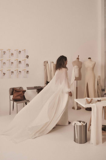 Carol’s dress was inspired by her vibrant personality, timeless elegance, and the dreamy atmosphere of her wedding on the Greek island of Sifnos. The design featured a sleek A-line gown with hourglass seams and a draped halter V-neckline in luxurious razmir satin. To complement the ceremony, we added a flowing chiffon kimono with an extra-long tail, designed to flutter in the island’s summer breeze as she ascended the chapel steps. For the celebration, chiffon wings attached to a choker allowed the fabric to gracefully follow her hand movements, reflecting Carol’s minimal yet bold sense of style.